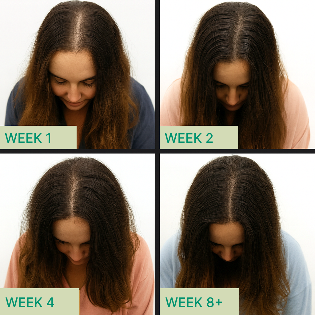 Visible fullness and new growth typically appear around 6–8 weeks with consistent use.